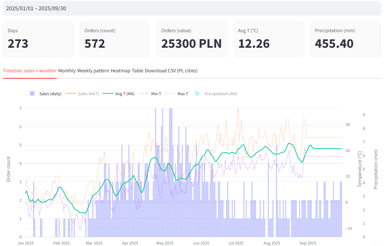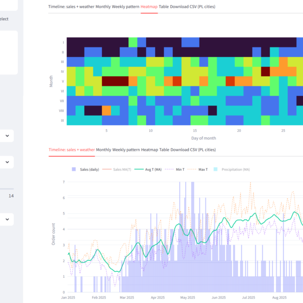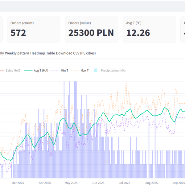 - Multi-Factor Analyzer to narzędzie przeznaczone do monitoringu sprzedaży produktu różnych czynników, przykładowo: warunków pogodowych. Przykładowe wdrożenie: integracja z API pogodowymi różnych baz danych i danymi sprzedażowymi z Baselinker. Wygląd aplikacji - według wymagań klienta. Szczegółowe warunki współpracy i indywidualnej oferty możesz uzyskać kontaktując się poprzez wiadomość e-mail.